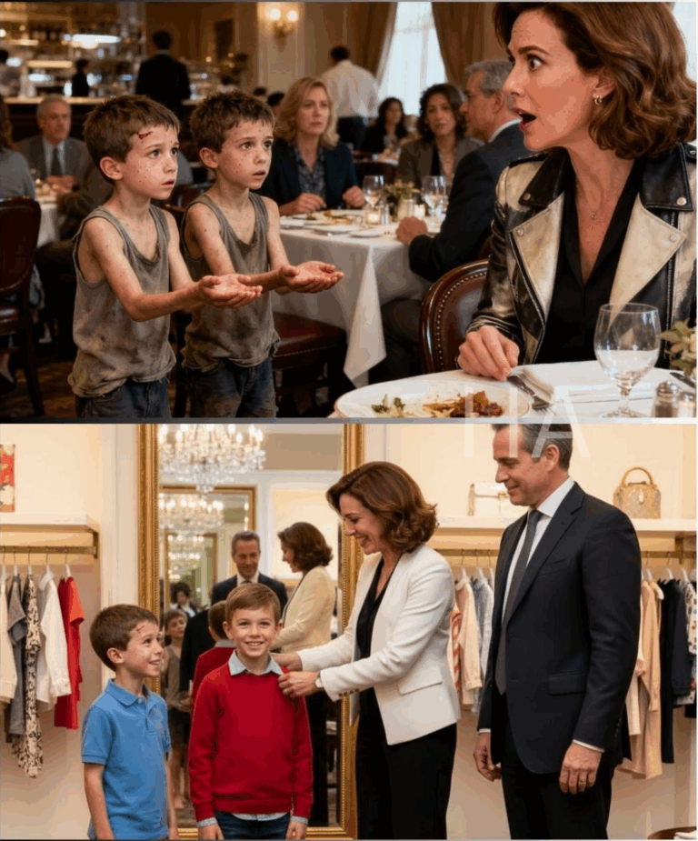 Δύο άστεγα αγόρια, δίδυμα, πλησίασαν το τραπέζι μιας πλούσιας γυναίκας και ρώτησαν διστακτικά: «Κυρία, θα μπορούσαμε να έχουμε τα περισσεύματα του φαγητού σας;» Μα όταν εκείνη σήκωσε το βλέμμα της, η καρδιά της πήγε να σταματήσει — τα πρόσωπά τους ήταν ολόιδια με των δύο γιων της, εκείνων που αναζητούσε απεγνωσμένα από τη μέρα που εξαφανίστηκαν…