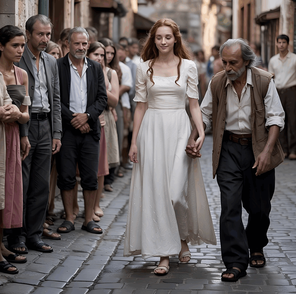 Τραβηγμένη προς εκείνον τον άντρα, πιασμένη στο χέρι του σαν φάντασμα, άκουγε τους ψιθύρους και τα χλευαστικά γέλια πίσω της: «Η τυφλή κοπέλα και ο ζητιάνος…»