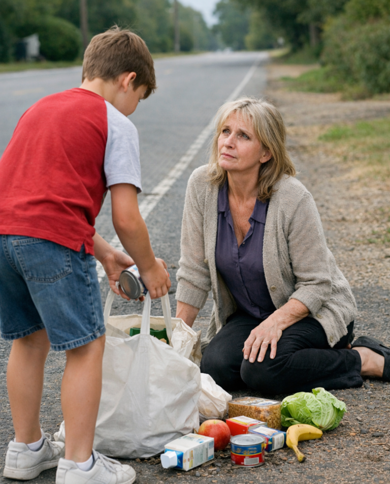 — Αγαπητέ… μπορείς να με βοηθήσεις;Δεν σκέφτηκα τον κίνδυνο, τους κανόνες ή οτιδήποτε άλλο πέρα από την άμεση ανάγκη να βοηθήσω. Καθώς κατέβηκα στα γόνατα, καθάρισα τη βρωμιά από τις κονσέρβες, στοιβάζοντάς τες προσεκτικά στα χέρια μου.