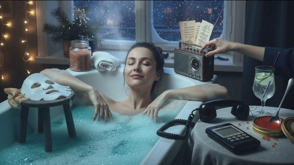 Στο μπάνιο άνοιξα ένα βάζο άλατα μπάνιου — δώρο από τρία χρόνια πριν, φυλαγμένο «για αργότερα».Το νερό έγινε μπλε, μύριζε θάλασσα. Αφρός μέχρι το χείλος. Jazz έπαιζε. Χωρίς βιασύνη Πρωτοχρονιάς, μόνο αργό σαξόφωνο jazz.Έκλεισα τα μάτια. Καμία χήνα. Καμία πατάτα. Μόνο εγώ και η σιωπή.