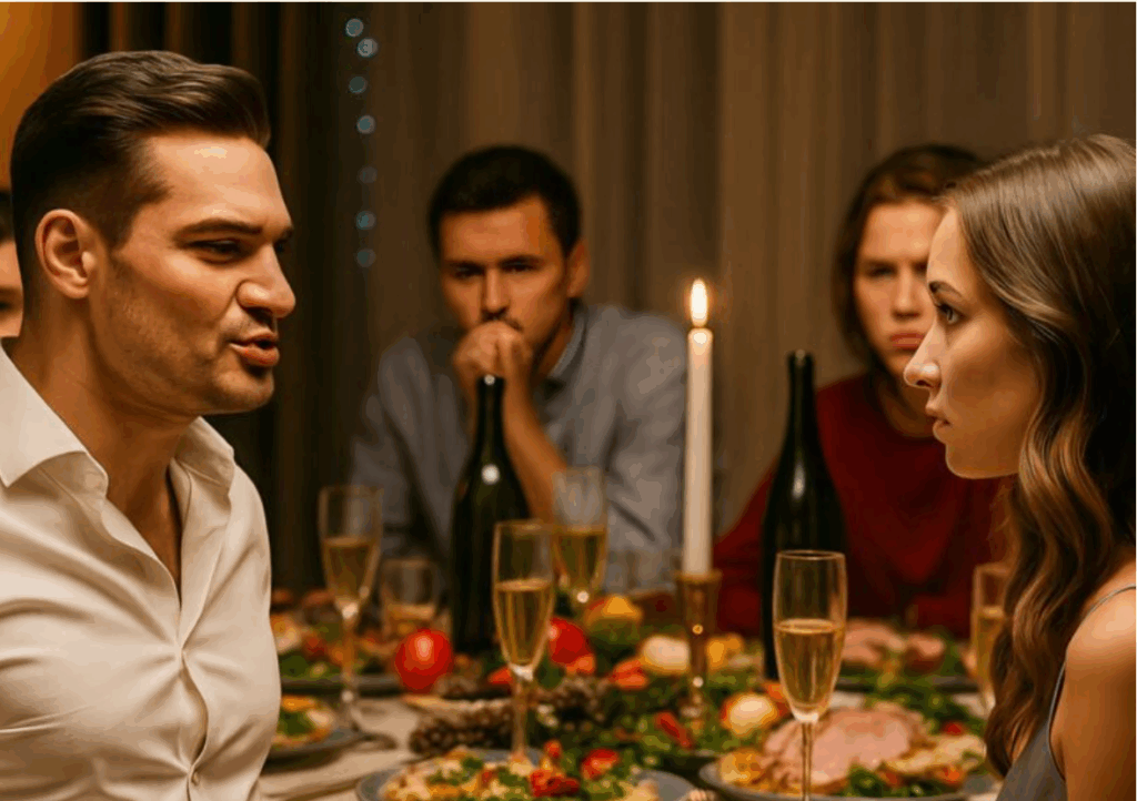 Οι οικοδεσπότες μας μας υποδέχτηκαν με θέρμη. Το τραπέζι ήταν στολισμένο με εκλεκτά φαγητά, τα κεριά έριχναν μια ζεστή λάμψη, και οι σαμπάνιες έλαμπαν στα ποτήρια μας. Οι συζητήσεις κυλούσαν εύθυμες,