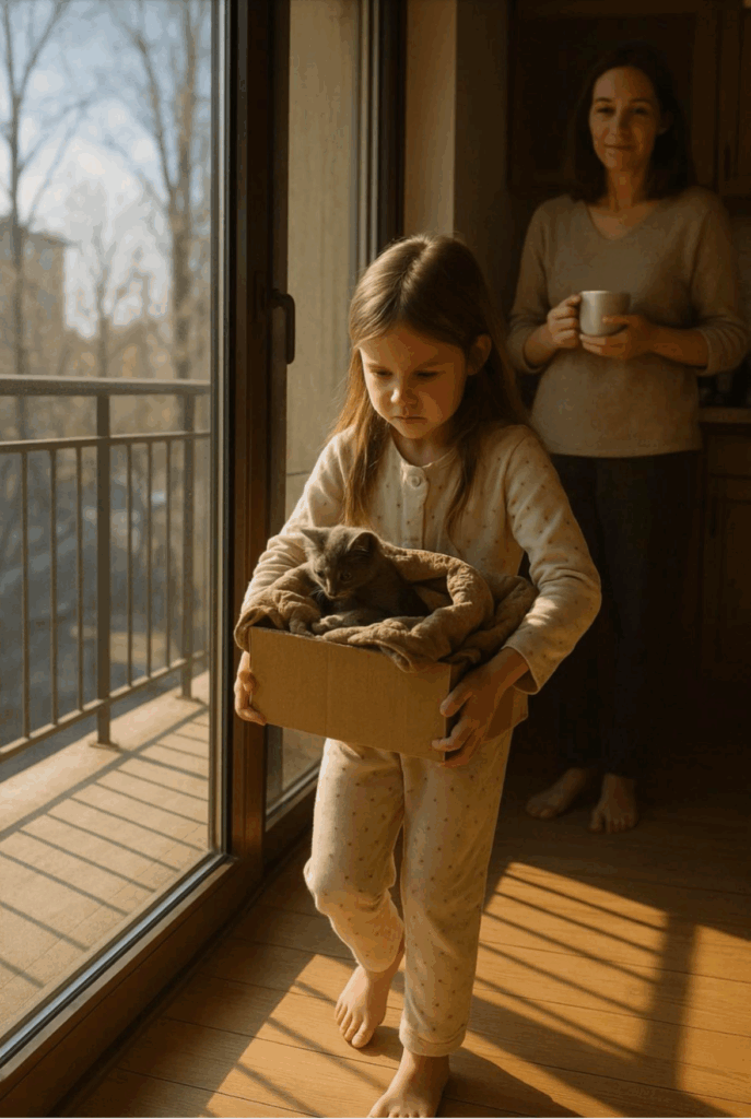 Έτσι γεννήθηκε το μυστικό σχέδιο της Λούσι: το γατάκι θα ζούσε στο μπαλκόνι, μέσα σε ένα κουτί, με μια κουβέρτα και ένα μικρό πιατάκι — μέχρι να γίνει αρκετά δυνατό.Οι πρώτες νύχτες ήταν οι πιο δύσκολες. Το γατάκι έκλαιγε, ζητούσε ζεστασιά, και η Λούσι,